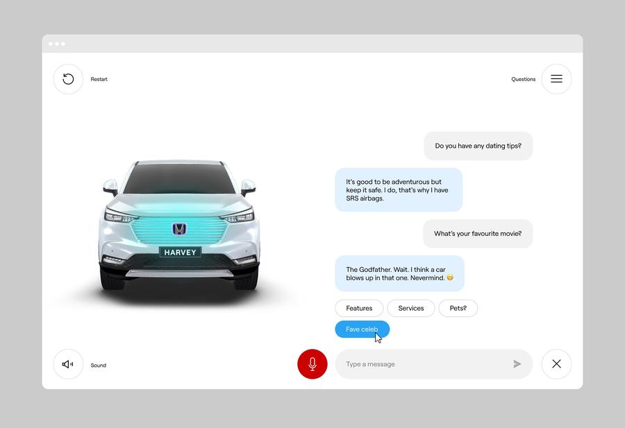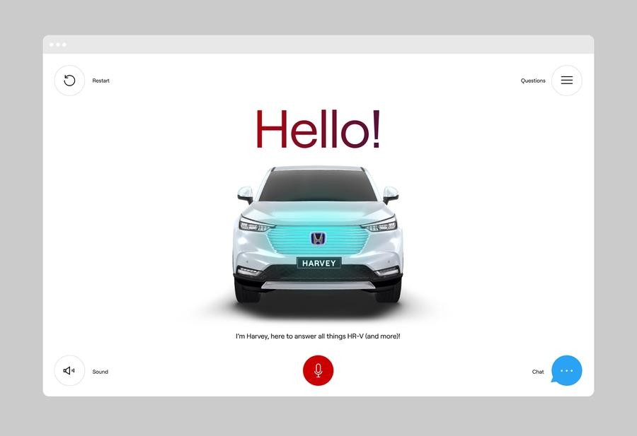Meet Harvey, the car that can literally sell itself. To launch the new HR-V, we brought it to life using pre-ChatGPT AI, giving Honda customers a new way to learn about the car. Through the web experience, users could ask Harvey questions about his features, mileage, where to buy him, and more. Harvey also lived across TVC, OOH, radio, and a working prototype that toured the country.